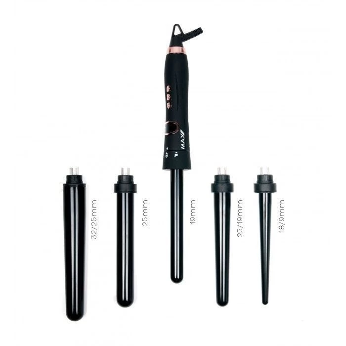De naam van de Max Miracle 5in1 Krultang zegt het al! Een geweldige krultang voor iedereen die snel gemakkelijk een volle bos en glanzende krullen wilt. Bij dit fantastische pakket krijg je vijf verschillende opzet stukken van (18/9mm, 19mm, 25mm, 25/19mm en 32/25) meegeleverd zo kan jij eenvoudig verschillende looks creëren.